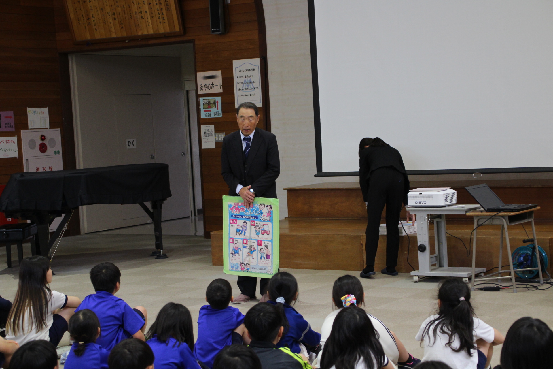 4月8日(水)には防犯教室が行われました。南アルプス警察署より生活安全課の警察官の方や,スクールサポーター,櫛形西地区駐在所の警察官の方が子どもたちに向け,不審者への対応や交通安全などについて,わかりやすく話をしてくださいました。