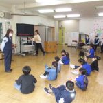 4月21日(火)1・2年生を対象にした交通安全教室が行われました。最初に,交通ルールについて確認し,「横断歩道の渡り方」や「道路の歩き方(右側通行)」などについて,DVDを見ながら説明を受けました。