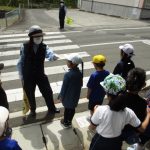 後半は,実際に外に出て横断歩道を渡る練習をしました。学校前の横断歩道に出ると,上の方からも下の方からも車が往来があり,子どもたちが渡る準備のために手を挙げると止まってくれたり,減速して様子を見てくれたり,実際に雰囲気を感じながら練習することができました。